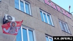 Над входом в здание городской администрации чиновники недавно повесили еще и флаг с изображением российских солдат на фоне Христа.